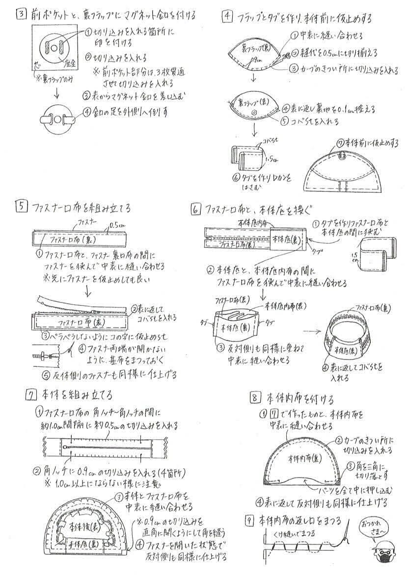 ※サンプルには本体前後、本体底、前ポケット、ファスナー口布、フラップ、裏フラップマグネット付け位置に接着芯を使用